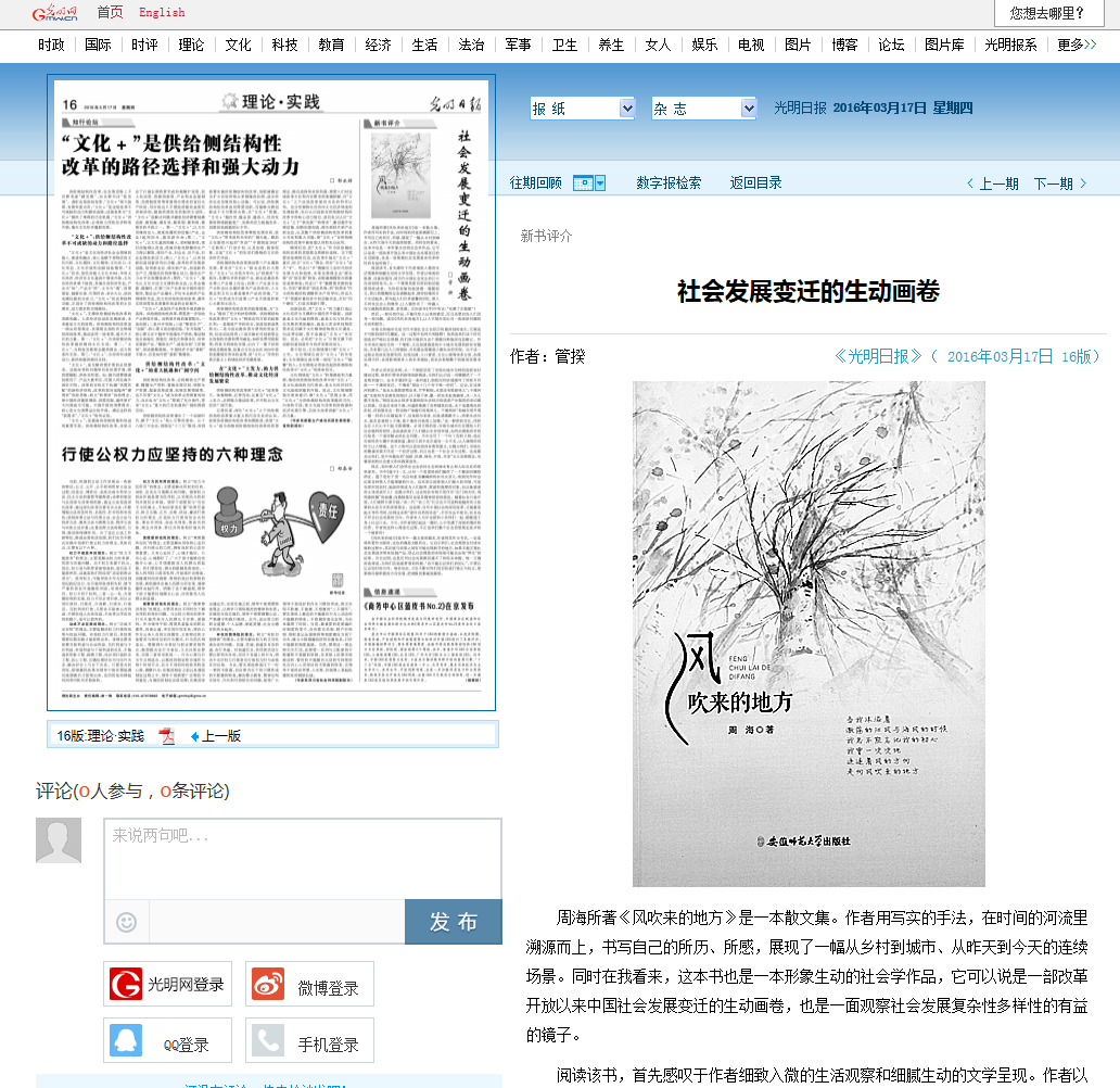 《光明日报》2016年3月17日第16版“理论与实践”之“新书评介”栏目,以1800多字的篇幅,发表署名管揆的评论文章《社会发展变迁的生动画卷》,积极推介安徽师范大学出版社出版发行的新书《风吹来的地方》。